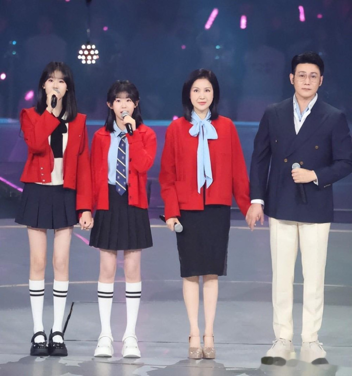 只有钟丽缇的女儿看着很拘谨,抿着嘴双手搭在腿上,表情看起来也放不开。