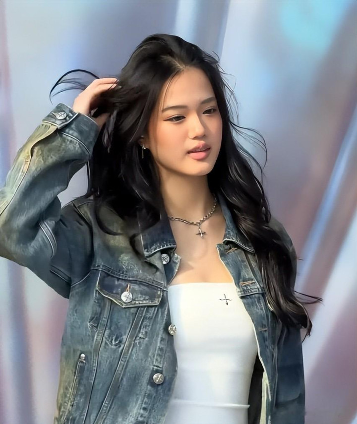 但是当她自己一个人的时候看着就自信了不少,这次活动她穿着牛仔外套,里面一个白色抹胸。